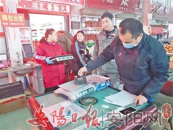 市质量技术监督检验测试中心市场衡器室组织技术人员历时3个月,对市区内23个大型农贸市场在用的近1500台电子秤进行了免费周期检定,使市场公平秤检定率达到100%,由法人或自然人主办、固定或封闭场所经营的集贸市场以及大中型超市电子秤检定率达到90%,切实维护了广大人民群众的合法权益。图为12月24日,该衡器室技术人员对龙安区烧盆窑市场的电子秤进行检定。(唐宏峰 摄)