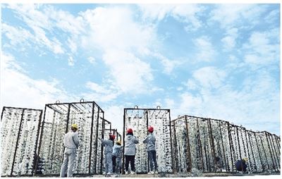 图为2021年12月20日,该集团员工在对终端水处理系统填料框进行技改修复。