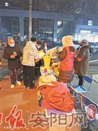 1月9日5时20分,光华路街道办事处兴泰苑社区工作人员在社区志愿者微信群里发出紧急通知,希望有时间、有能力的志愿者前来社区协助工作。“社区在岗工作人员只有6名,辖区有2700余户需要进行核酸检测,这两天各个检测点全靠志愿者协助维持秩序。”兴泰苑社区党总支书记申艳超告诉记者。“稍等一会,检测物资马上就到。请大家排好队准备检测。”在德隆街德隆苑小区门口,社区工作人员一边组织居民准备核酸检测,一边向志愿者和医务人员介绍目前的准备情况。在能源路一个核酸检测点,一位身穿红马甲的社区志愿者告诉记者:“天不亮就开始准备了,为的是能够尽快开始检测,早日控制住疫情。”在彰德路,记者看到每一个核酸检测点都有身着红马甲的志愿者,他们拿着喇叭一边维持秩序,一边解答群众的问题。这些志愿者队伍中,有些是社区群众,还有的是辖区相关单位的工作人员。