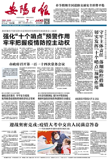 袁家健强调,要高度警惕松懈、厌战情绪,发扬连续作战精神,围绕发挥“十个哨点”预警作用,进一步完善机制、压实责任,为稳步恢复正常社会生活秩序创造条件。“十个哨点”相关机构和企业要扛牢主体责任,对发现的问题举一反三、认真整改,自觉强化预警作用,严格落实落细各项疫情防控措施,确保不漏掉一个隐患点、不放过一个风险源。