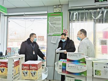 2月3日,区市场监管局全员上岗,配合街道(镇)检查辖区门店,发挥药店哨点预警作用,落实《药店规范检测流程》,确保管控有序、防控有效;强化餐饮门店关停巡查,严格落实疫情防控不开放堂食的要求,继续执行线上接单、线下配送,通过一系列措施,确保防疫工作落实到位,让群众安心欢度春节。 图为工作人员在检查辖区药店。 (王伟 摄)
