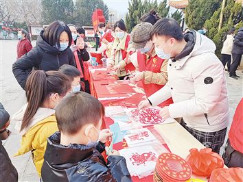 2月11日上午,北关区市场监督管理局志愿者与安阳市洹园志愿服务站联合开展“我们的节日·元宵节”主题活动。活动现场有欢庆元宵节的表演,还专门聘请手艺人现场传授技艺,并通过猜灯谜免费为群众发放灯笼。图为活动现场。