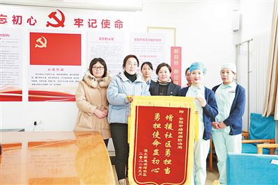 图为2月14日,北关区洹北街道滨河社区负责人代表社区送去锦旗,感谢医务人员严谨、高效的核酸采样工作。