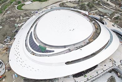 从空中俯瞰即将竣工的杭州亚运会电竞馆。