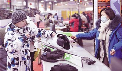 2月22日,游客在大明山万松岭滑雪场领取装备,准备滑雪。