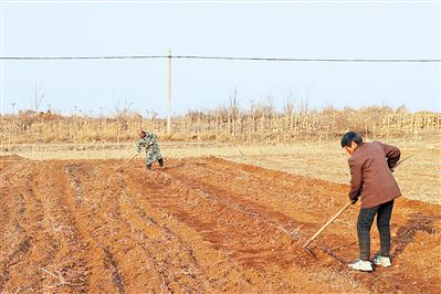 2月23日,黄华镇桃园村村民郭玉林夫妇在自家的农田里整理土地,准备种植谷子。眼下,春耕生产已在林州市全面展开。 (本报记者 张苗庆 摄)