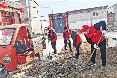 为巩固深化党史学习教育成果,助力乡村振兴,2月25日下午,文峰区环卫中心组织40余名干部职工,出动1辆洗扫车、1辆洒水车、2辆道路养护车和6辆垃圾收集车,在党委领导班子的带领下,到宝莲寺镇东风村开展人居环境整治志愿服务活动。图为活动现场。(靳俊利 摄)