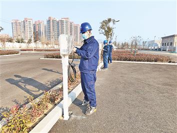 2月末的一个上午,天空如洗。明媚的阳光下,在市文体中心西南侧停车场内,一排排崭新的新能源汽车充电桩很是耀眼。穿着工作服的工人在场内忙碌着,有的整理充电线,有的擦拭充电桩,还有的检测电路。