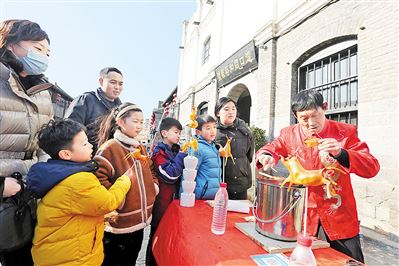 2月27日,在滑县道口古镇历史文化街区,民间艺人、滑县“马氏吹糖人”第十六代非遗传承人马电坤向游客展示吹糖人技艺。