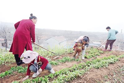 2月27日,龙安区马家乡李庄村如诗如画的山坡上,村民在农田里锄草,小山村一片繁忙的春耕景象。(毕兴世 摄)