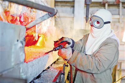 图为窑炉流液口及唇砖加宽改造现场。(本报记者 李雪/文 韩亚朝/图)