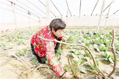 半坡店镇佳威家庭农场流转了常年外出打工村民几乎撂荒的7公顷土地,经过综合开发治理,栽植了梨、葡萄、猕猴桃等林果,并间种了西瓜、甜瓜、时令蔬菜和花生、红薯、谷子、大豆等小杂粮。种植结构的调整和种植模式的优化,实现了林茂粮丰,辐射带动了村内100多户农民种植瓜果蔬菜70多公顷,解决了周边村庄150余人的就业问题。去年9月,该农场成功注册“零河红”商标。 图为2月27日,佳威家庭农场女主人刘艳花正在葡萄间作生菜大棚内工作。 (毕兴世 摄)