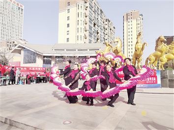 3月4日下午,市委老干部局银龄志愿服务队一行60余人来到北关区豆腐营街道新村社区,和该社区联合开展“爱心奉献社会 志愿传播文明”学雷锋志愿服务活动。队员们在现场进行义珍、剪纸教学和文艺演出,并提供法律咨询、修车等服务。舞蹈《中国大舞台》、豫剧《红色娘子军》选段、河南坠子《雷锋颂》等精彩的节目赢得了现场阵阵掌声,大家纷纷为队员们的热情服务和精彩演出点赞。(本报记者 张武杰 摄)