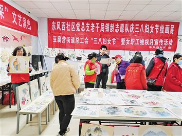 3月8日,市委老干部局银龄志愿服务队副队长杨社芬带领队员来到北关区豆腐营街道东风西社区,举办庆祝“三八”妇女节绘画展。