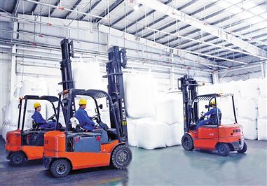 图为安阳龙宇新材料公司生产成品库员工在外销瓶级聚酯切片产品。