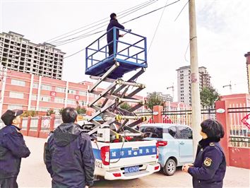 连日来,滑县城市管理局坚持以弱电入地为原则、以废弃线杆必拔除为标准,压茬作战,积极协调组织弱电整治联席会议各成员单位,对县城主次干道进行弱电整治及线杆清除工作,旨在切实改善市容面貌,为广大群众营造干净清爽的低空环境。图为工作人员正在清理“蜘蛛网”。(祝 巍 摄)