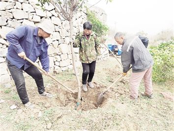 刘文英所说的困难地主要是指林地条件较差地块。因为山是石山,土层很薄,不能用机械,只能靠人力。树苗要靠工人一棵一棵地背上山。挖坑要挖大坑,用石头垒圈,然后回填客土,改善立地条件,搭建鱼鳞板,保证浇的水不流失。“起苗、挖坑、栽植、浇水一天内完成,工作量大,一个人一天种不了10棵树。”天喜镇村植树队长孙风军指着面前的一座山告诉记者,“在山区植树,没有水就没法保证成活率。造林之前,我们就铺设好了管网,管道直接通到山顶。”在这座海拔280米的山上,树木栽种完成后,孙风军带领的团队还要负责定期浇水、剪枝,给树木添加生根粉、保水剂或覆薄膜以保墒情,至少浇4遍水才能保证树苗成活。