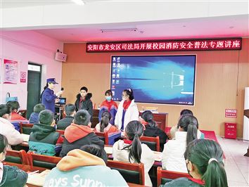 近日,龙安区司法局在西八里小学举办消防安全普法专题讲座。该局工作人员为学生发放了《法在校园》、消防安全知识宣传折页等宣传资料,龙安区消防大队工作人员则通过播放消防动画短片、现场教学正确使用灭火器等方式,激发了该校师生学习消防及法律知识的积极性,提高了他们的消防安全意识和处理突发事件的应变能力,受到欢迎。 (本报记者 王晓楠 摄)