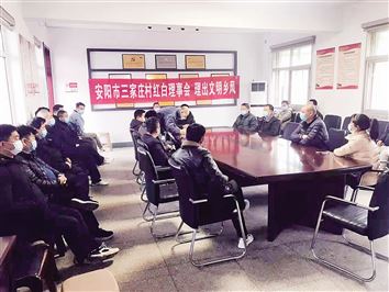 3月18日上午,龙安区东风乡三家庄村组织召开红白理事会日常工作会议,目的是进一步完善红白理事会的运行和管理机制,深入治理大操大办之风,弘扬新风正气,倡导农村文明新风尚。该村成立红白理事会以来,实行自我管理、自我教育、自我服务。现在,村民办婚丧事不攀比,不铺张浪费,既文明又节俭。(郝姚川 摄)
