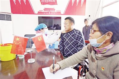 3月19日,在殷都区都里镇上寺坪村,来自都里镇卫生院的党员、职业医生赵静茹正在为该村群众接种第三针(剂)新冠疫苗。殷都区全面启动18岁以上人群新冠疫苗第三针(剂)接种工作,都里镇迅速行动,调遣全镇各村职业医生积极配合,对全镇群众应接尽接,不漏一人。(毕兴世 摄)