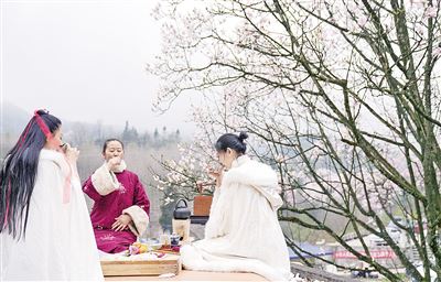 江油市大康镇戴天山村辛夷花盛开,几名茶艺爱好者在花林下品茶(3月23日摄)。