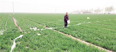 眼下正值小麦拔节期,滑县农民在农技人员的指导下,积极开展冬小麦浇水、施肥、化学除草等各项田间管理工作,到处一派繁忙景象。图为3月22日,小铺乡界河路村农民正在为小麦浇水、施肥。(王付强 摄)