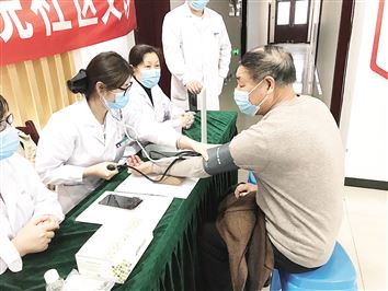 图为近日,该管理处组织医护人员为小区业主测量血压,并进行问诊、推拿等,引导业主养成良好的生活习惯。