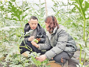 随后,专家团队到马上乡赵信村和东庄镇乔庄村早春大棚西甜瓜种植基地进行技术指导,及时解决瓜农在生产中遇到的各类技术难题,为内黄县瓜菜产业发展提供了科技支撑。图为杜瑞民(左)在指导农户。(任领兵 摄)